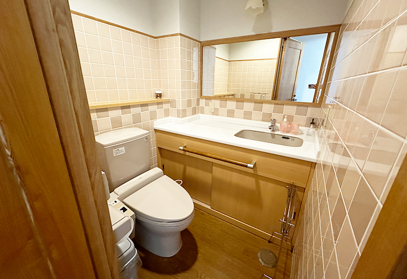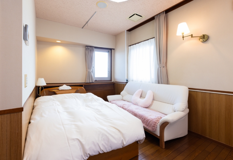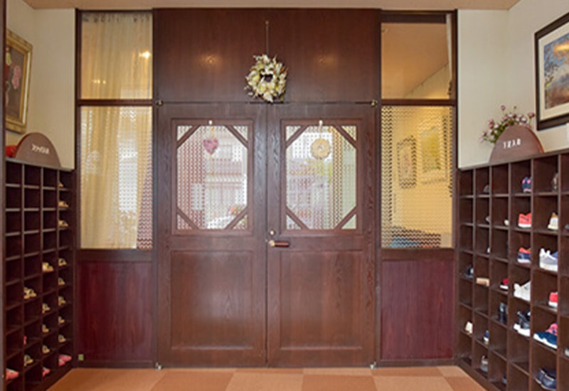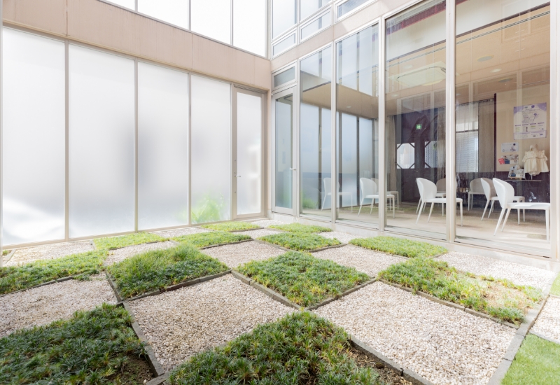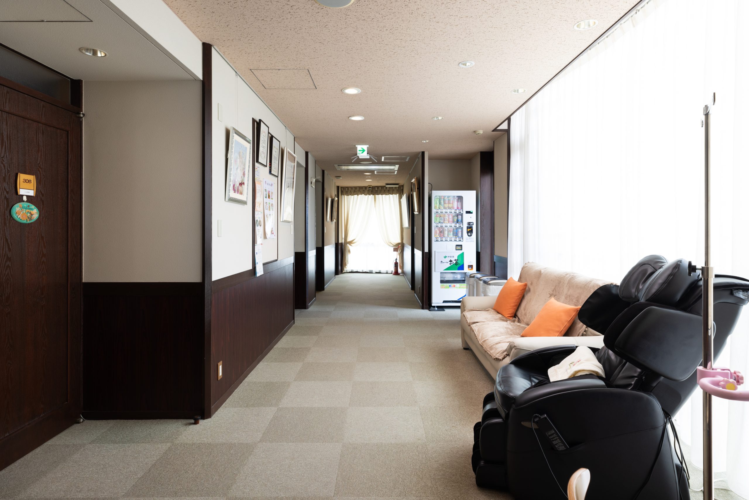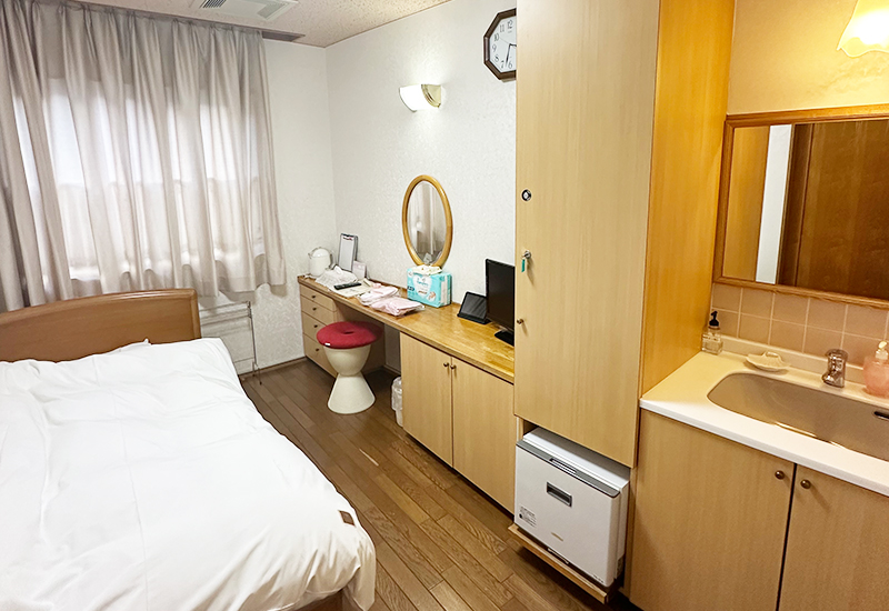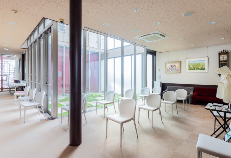 当クリニックはご家族でくつろいでいるような、リラックスした気持ちで入院中を過ごしていただくことを第一に考えております。クリニックの外来待合室には中庭からたくさんの光が入ります。木をふんだんに使いスリッパの音がしないように床には絨毯を敷きつめています。クリニックのイメージカラーである白とピンクを基調とした暖かみのある優しい空間となっています。